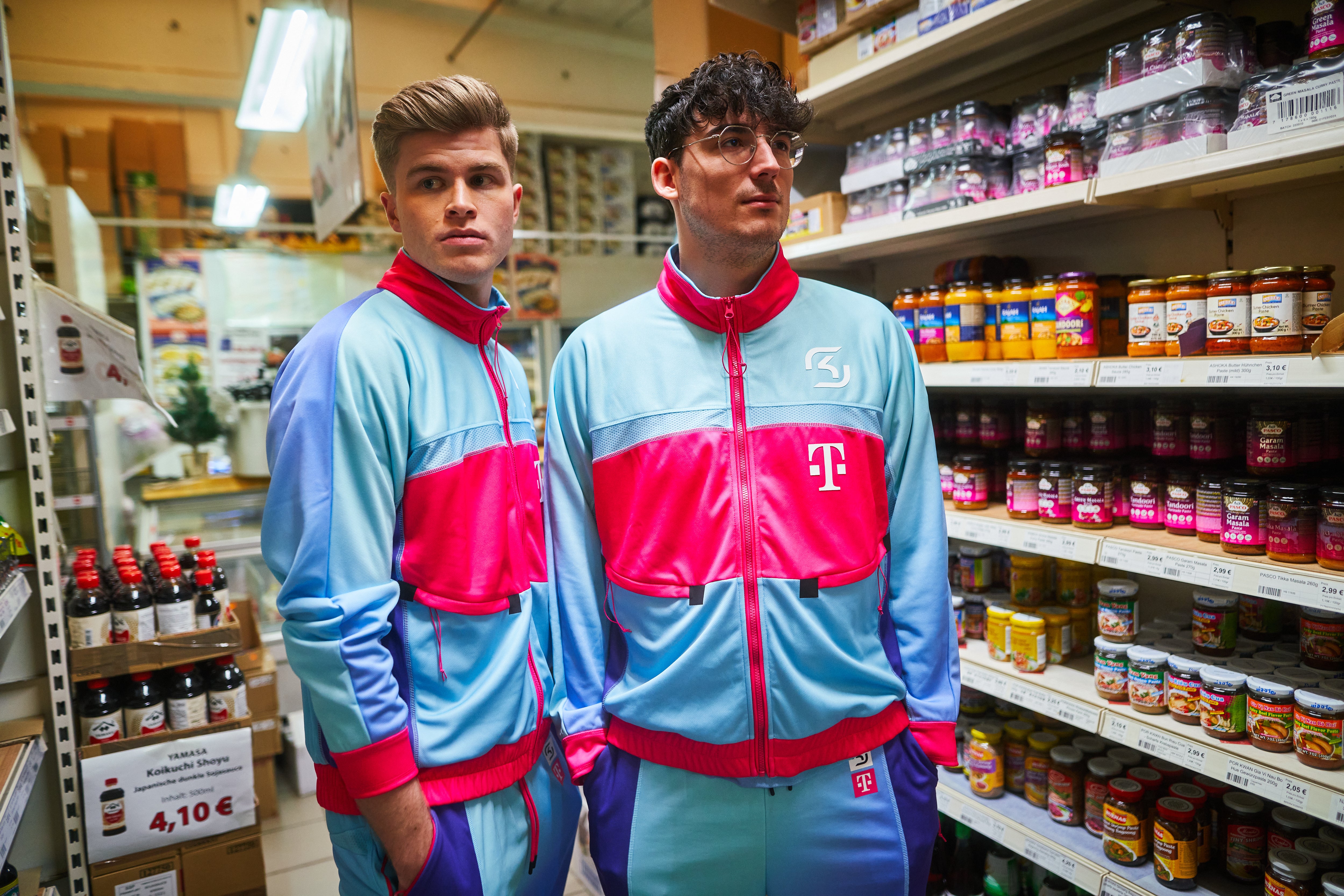 This is it. The official 2023 SK Gaming Training Jacket our players are repping in Germany and around the world. It's (bright) blue. It's (vibrant) purple. It's magenta. And it's all over the place and gives you plenty of reasons to love or hate it. And even more to get one. Approved by our handsome models.